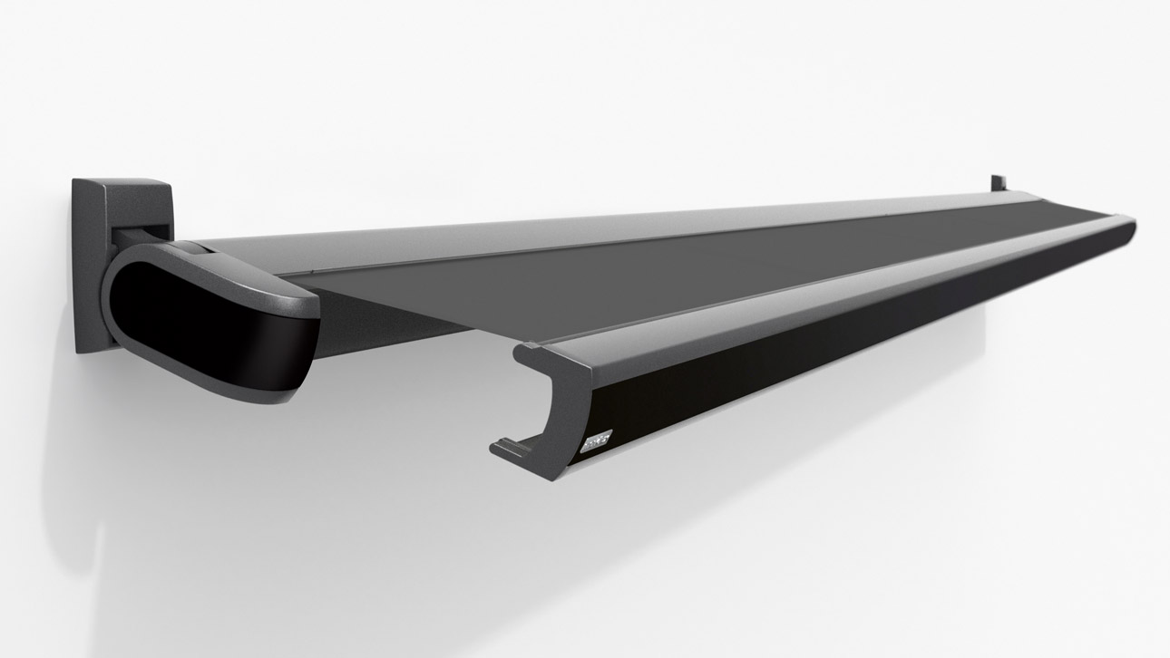 Aus dem Ausfallprofil wird ein zusätzliches Markisentuch senkrecht herabgelassen und bietet so wirksamen Blendschutz auch bei tiefstehender Sonne.